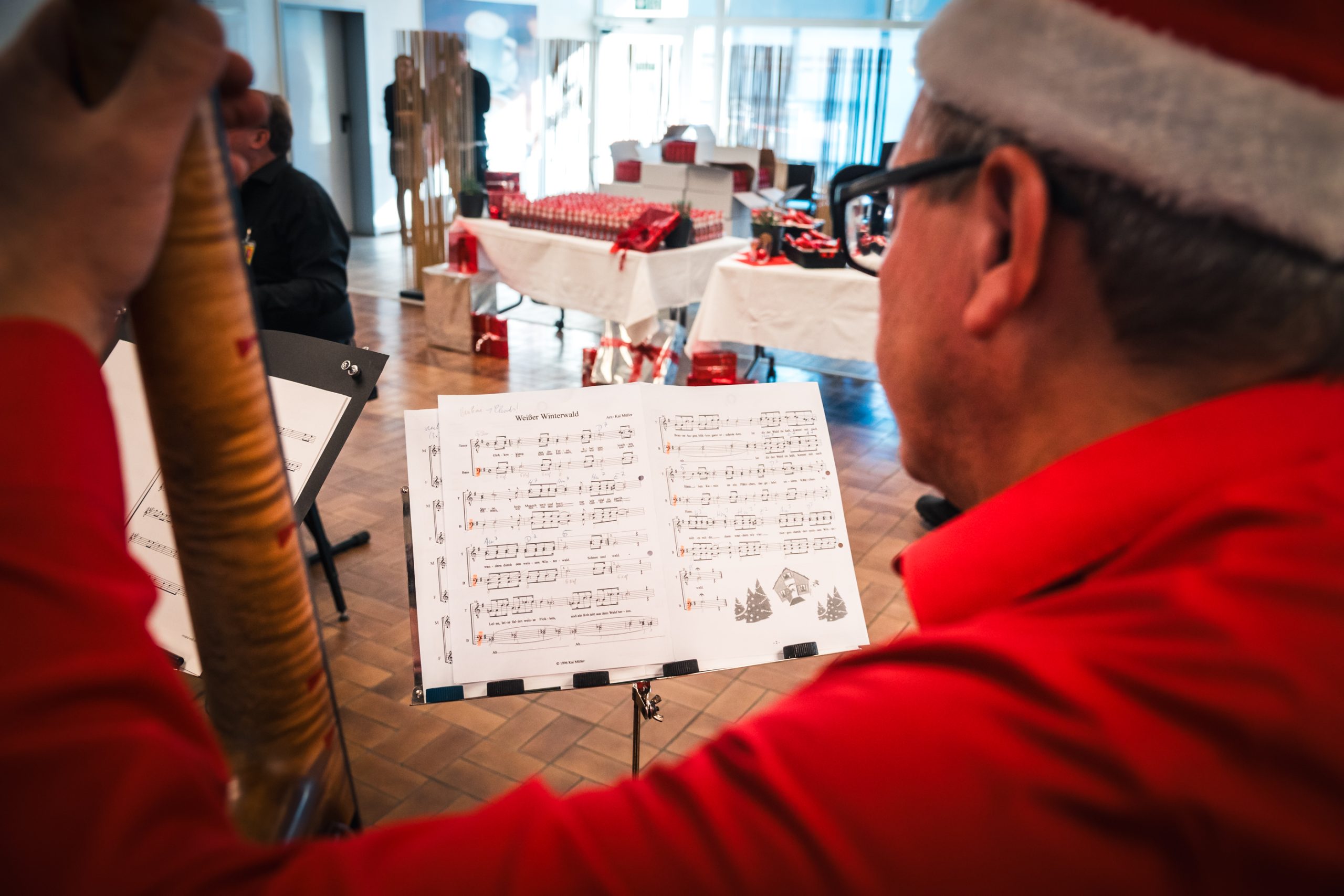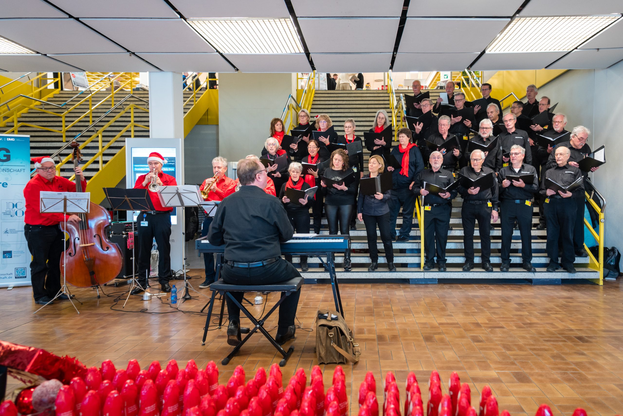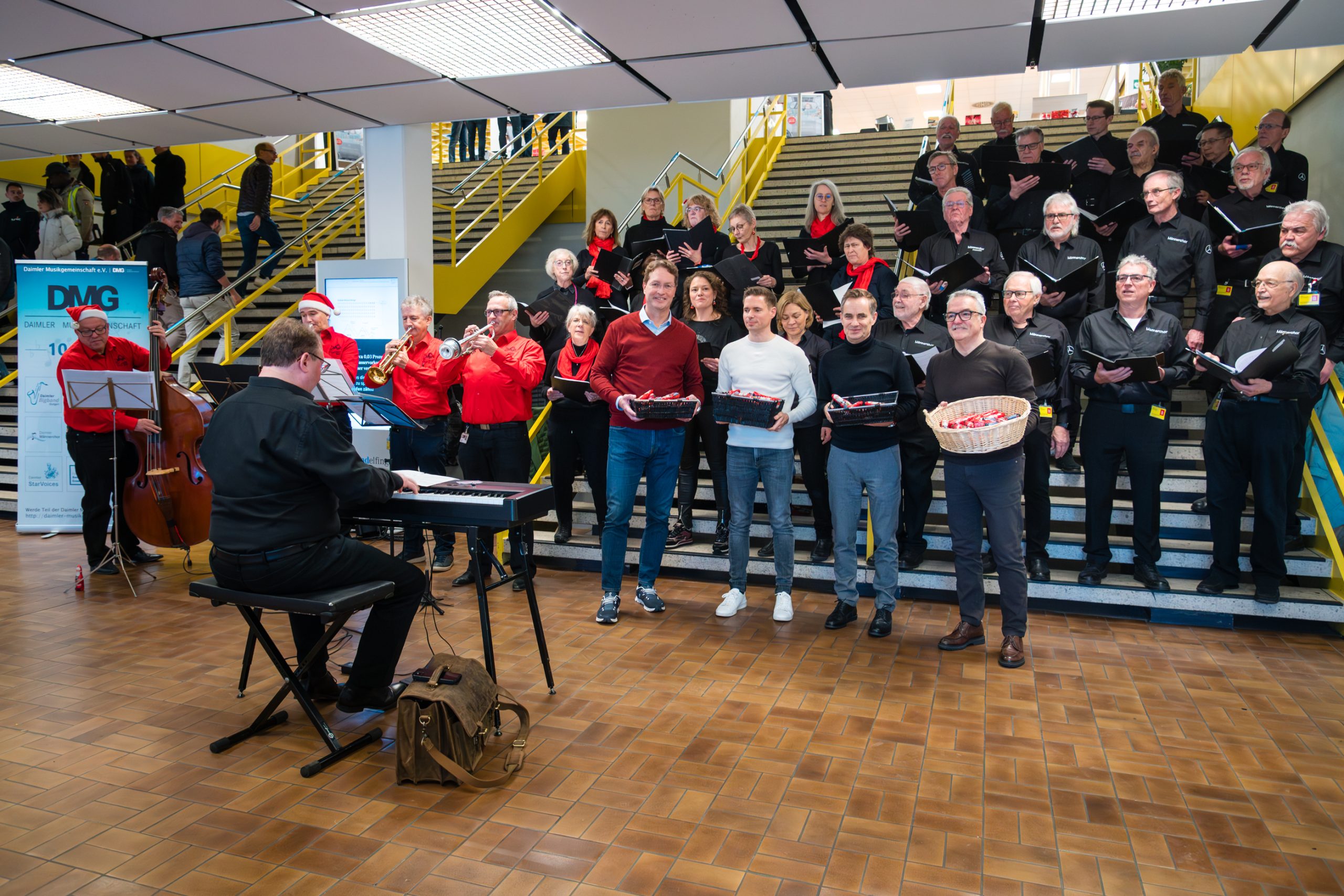 Als die Anfrage kam, waren spontan viele Sänger-innen bereit dabei zu sein. Unter der Leitung von Kai Müller (Chorleiter vom Daimler Männerchor), zusammen mit vier Musikern von der Daimler Big Band, dem Daimler Männerchor und einigen Chormitgliedern vom Daimler Chor wurden festliche Weihnachtslieder gespielt und gesungen.